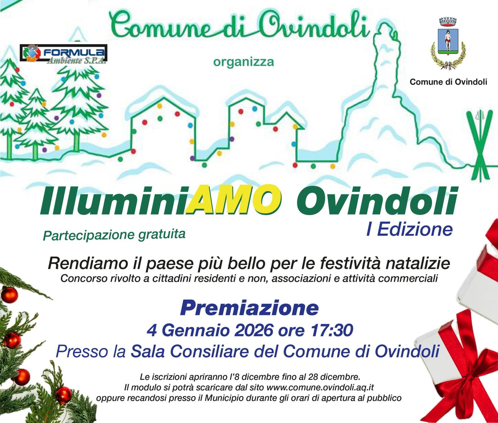 Il comune di Ovindoli organizza IlluminiAmo Ovindoli - I edizione “Rendiamo il paese più bello per le festività natalizie “ Concorso rivolto a cittadini residenti e non, associazioni e attività commerciali Partecipazione gratuita